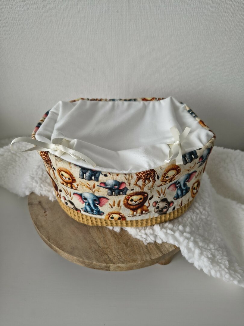 Onze stoffen afscheidsmandjes worden gratis verzonden. Het mandje kan worden gesloten door de binnenstof naar buiten te vouwen